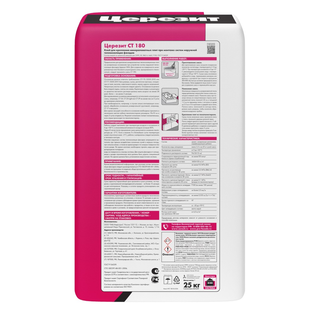 Описание товара: "Клей Ceresit СТ 180 для крепления минераловатных плит (25 кг)"
