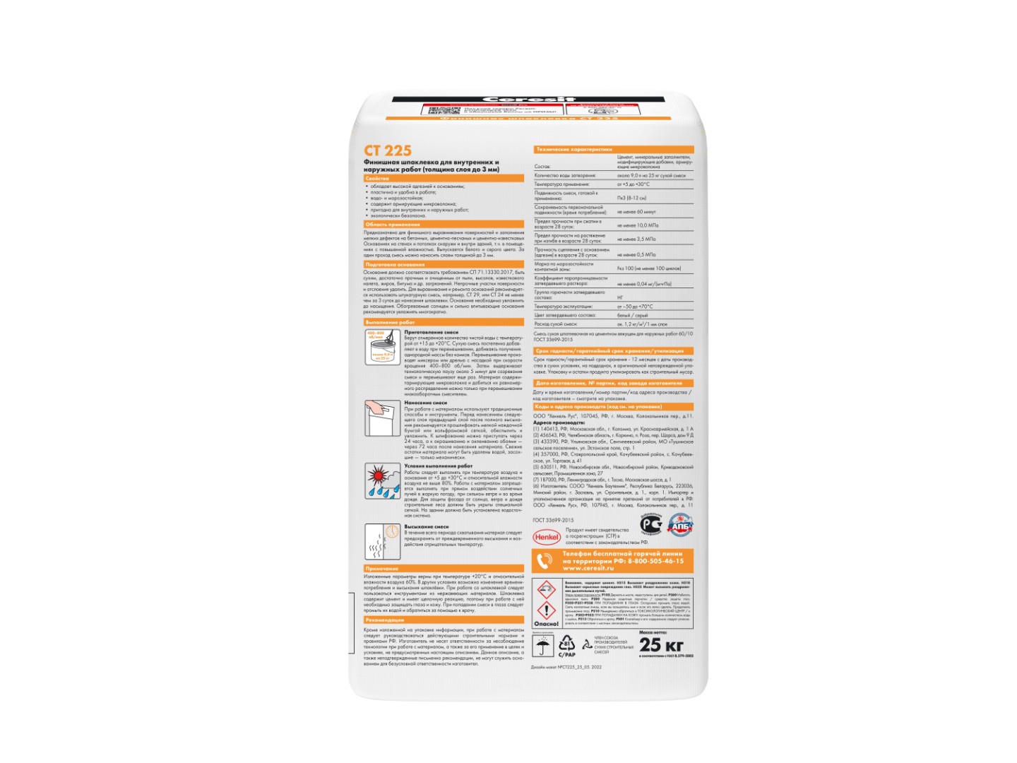 Описание товара: "Шпаклевка Ceresit СТ 225 фасадная белая (25 кг)"