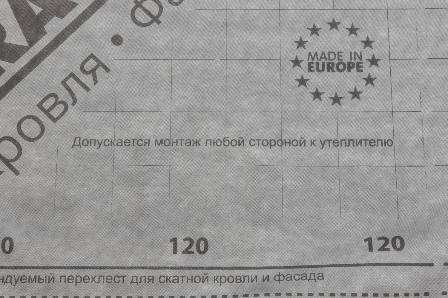 Температурная стабильность : от -40 °C до +80 °C (нагрев при максимальной температуре не дольше 8 часов). Данная пленка не является временной кровлей. Необходимо накрыть кровельным материалом в срок не более 30 дней. Пленка укладывается стороной с логотипом лицом к монтажнику.