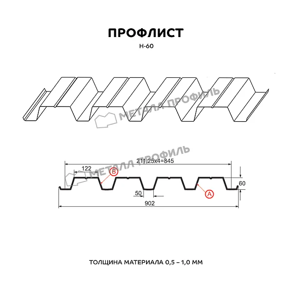 Профлист МЕТАЛЛ ПРОФИЛЬ Н-60x845-A (PURMAN-20-9005-0,5) — популярный материал для обустройства профилированного листа. Представляет собой лист оцинкованной стали с покрытием. Общая толщина металла с оцинковкой и полимерным слоем — 0.5 мм. Проходя процедуру холодного проката, металл принимает волнообразный вид. Такая конфигурация придает профилю жёсткость.